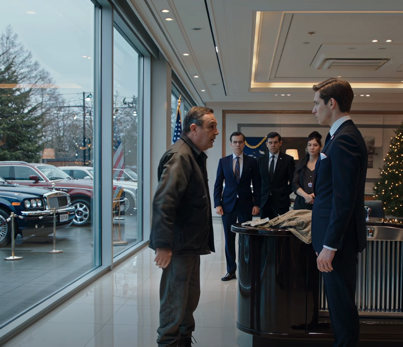 La neige glissait lentement sur les immenses baies vitrées du showroom Silverline Rolls-Royce, s’accumulant contre le verre comme un rappel silencieux d’un monde plus doux que celui qui avait forgé l’homme debout au milieu du sol de marbre.