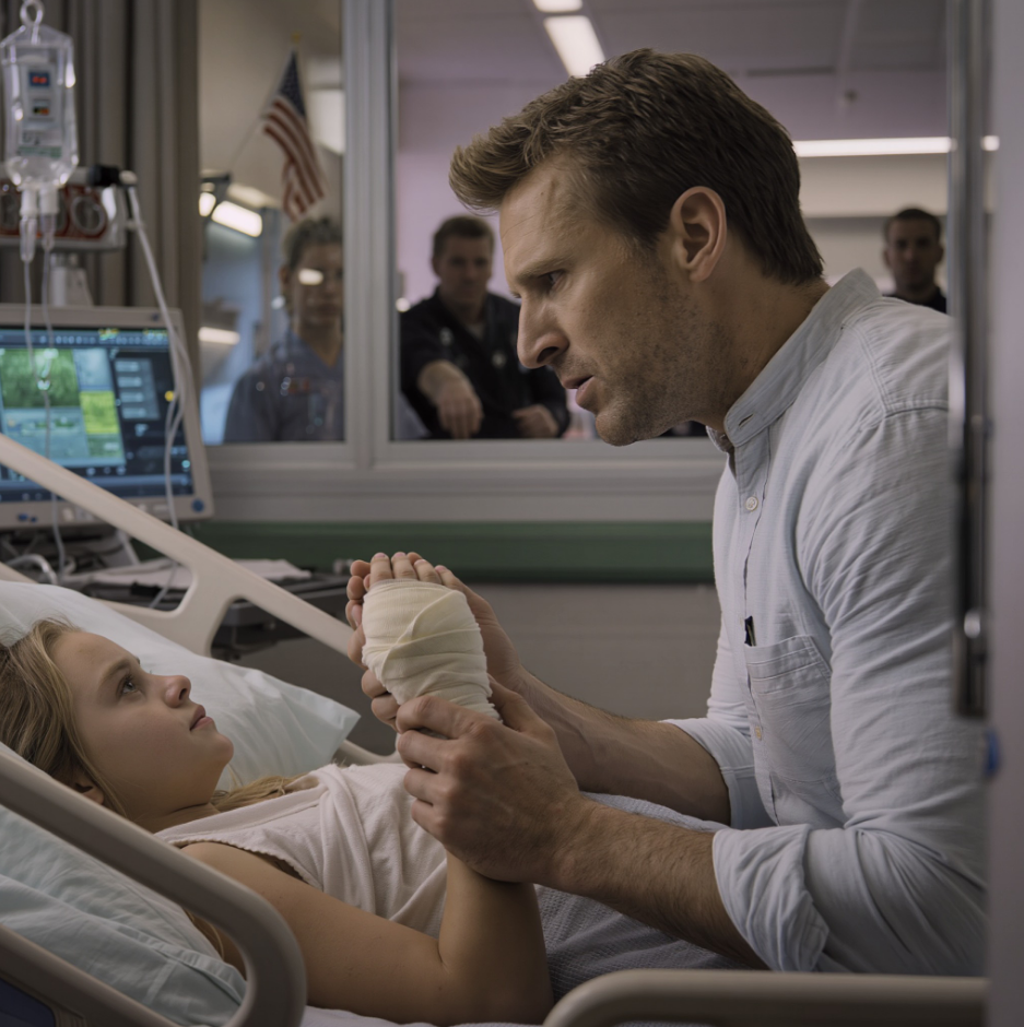 La porte de la chambre 247 était entrouverte. La pièce était sombre, éclairée principalement par la lueur des moniteurs. Emma était allongée dans le lit, si petit qu’elle se devinait à peine sous les draps blancs. Ses deux mains étaient enveloppées dans d’épaisses compresses et surélevées par des oreillers, les doigts entièrement dissimulés. Un tube transparent serpentait du creux de son bras gauche jusqu’à une pompe à perfusion qui bourdonnait doucement. Un moniteur émettait un bip régulier, trop fort, trop calme.