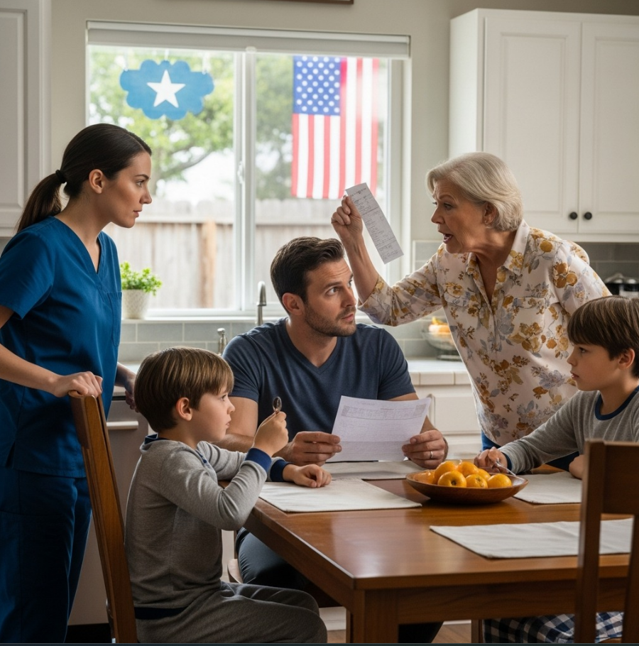 Derrière elle, mon mari, Mark, fixait le journal, le visage pâle sous la lumière jaune de la cuisine. Notre fils de six ans, Caleb, était assis à table en pyjama Spider-Man, sa cuillère à céréales à mi-chemin de sa bouche, les yeux grands ouverts et inquiets.