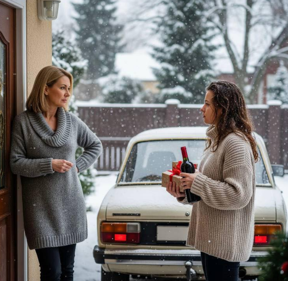 Je suis sorti dans le vent glacé, tenant le champagne, et j’ai marché vers l’entrée chaleureusement éclairée.
