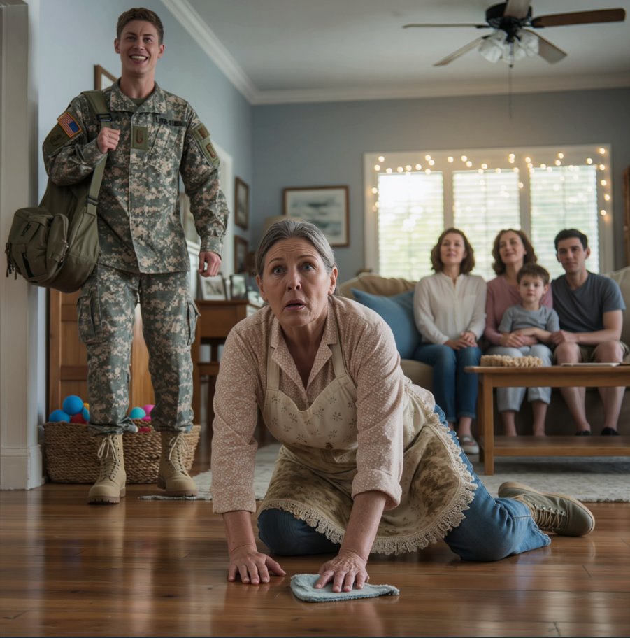 Mon fils est rentré après cinq ans de déploiement militaire et voulait me faire une surprise. Mais en ouvrant la porte, il m’a vue vivre comme domestique dans la maison que mon mari et moi avions achetée avant son décès. Perplexe, il a demandé : « Maman, c’est toi ? » Sa femme et sa famille m’avaient tout pris. Il a fait irruption dans la pièce en criant : « Ça suffit ! » Personne ne se doutait de ce qui allait suivre.