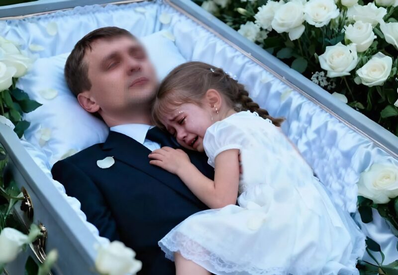 Pendant les funérailles, la petite fille s’est soudain approchée du cercueil ouvert, a posé ses mains sur la poitrine de son père et est montée dedans, se blottissant contre lui de tout son corps. Elle a posé doucement sa tête sur son épaule, comme si elle avait peur de le réveiller, et s’est mise à pleurer doucement, murmurant d’une voix tremblante :