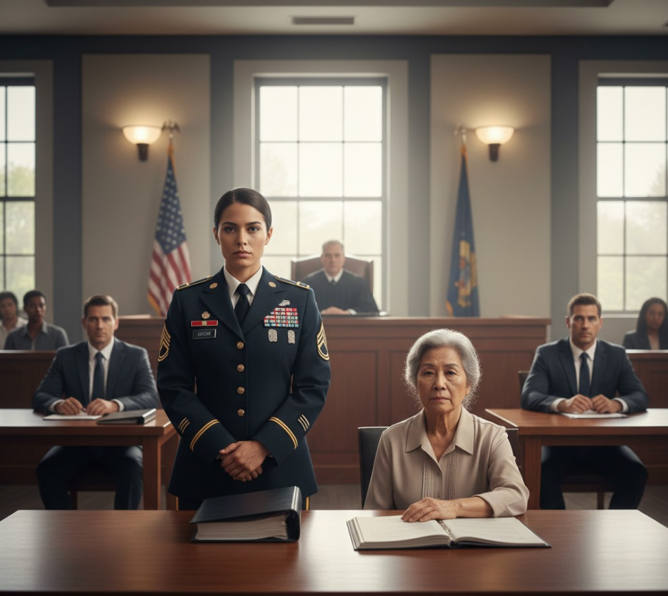 Alors que l’audience allait commencer, les portes de la salle d’audience s’ouvrirent brusquement . Un homme de grande taille, vêtu d’un uniforme de l’armée américaine, entra d’un pas décidé. Les médailles et les insignes qu’il portait sur les épaules attirèrent immédiatement tous les regards.